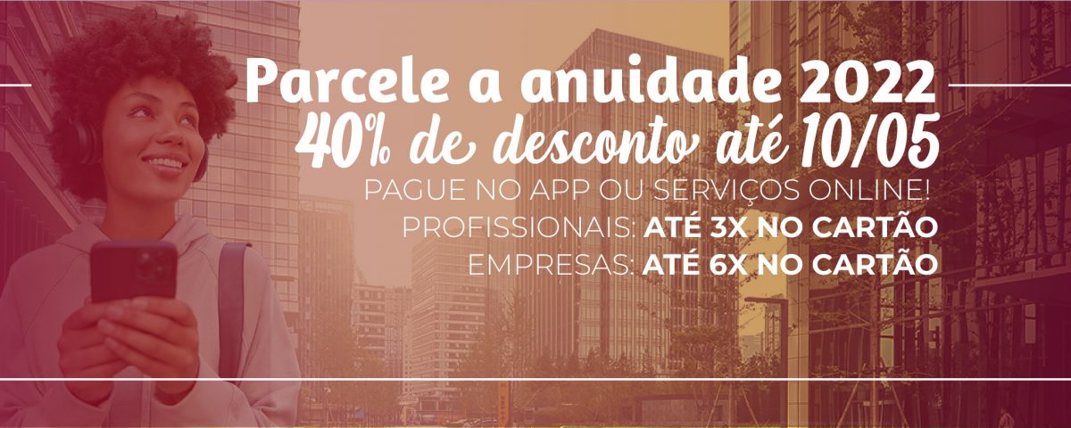 ÚLTIMO DIA – ANUIDADE 2022: PARCELE COM 2º DESCONTO DE 40% ATÉ 10/05